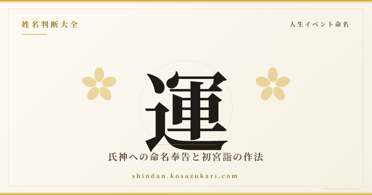 お宮参り(初宮詣/はつみやもうで)は、生後一ヶ月前後に氏神様に赤ちゃんの誕生と命名を奉告し、健やかな成長を祈願する儀礼です。命名後初めての公的な儀式として、姓名と氏神を結びつける節目にあたり、姓名運の長期的な祈りをここで定礎するという意味合いも持ちます。本記事では、男女別の参拝時期、初穂料、神社での命名奉告の作法、姓名判断との接続点までを実務目線で解説します。