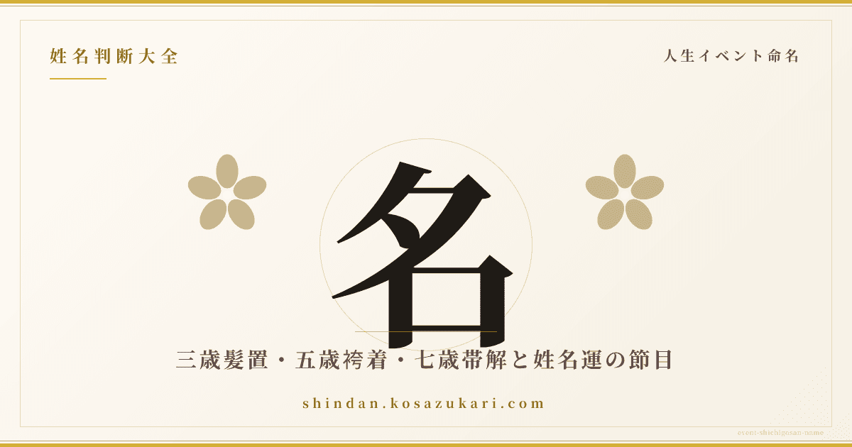 七五三は、平安期の「髪置(かみおき/三歳)」「袴着(はかまぎ/五歳)」「帯解(おびとき/七歳)」の三儀礼を一体化した子の成長祝いで、11月15日に氏神に詣でて健やかな成長を祈願します。姓名判断的には、地格(名の総画数)が司る「7歳までの若年運」が一区切りつく節目として重要視され、改名や通称名導入の検討タイミングともなります。本記事では、儀礼の由来、男女別の節目、姓名運との関係、現代の実務までを解説します。