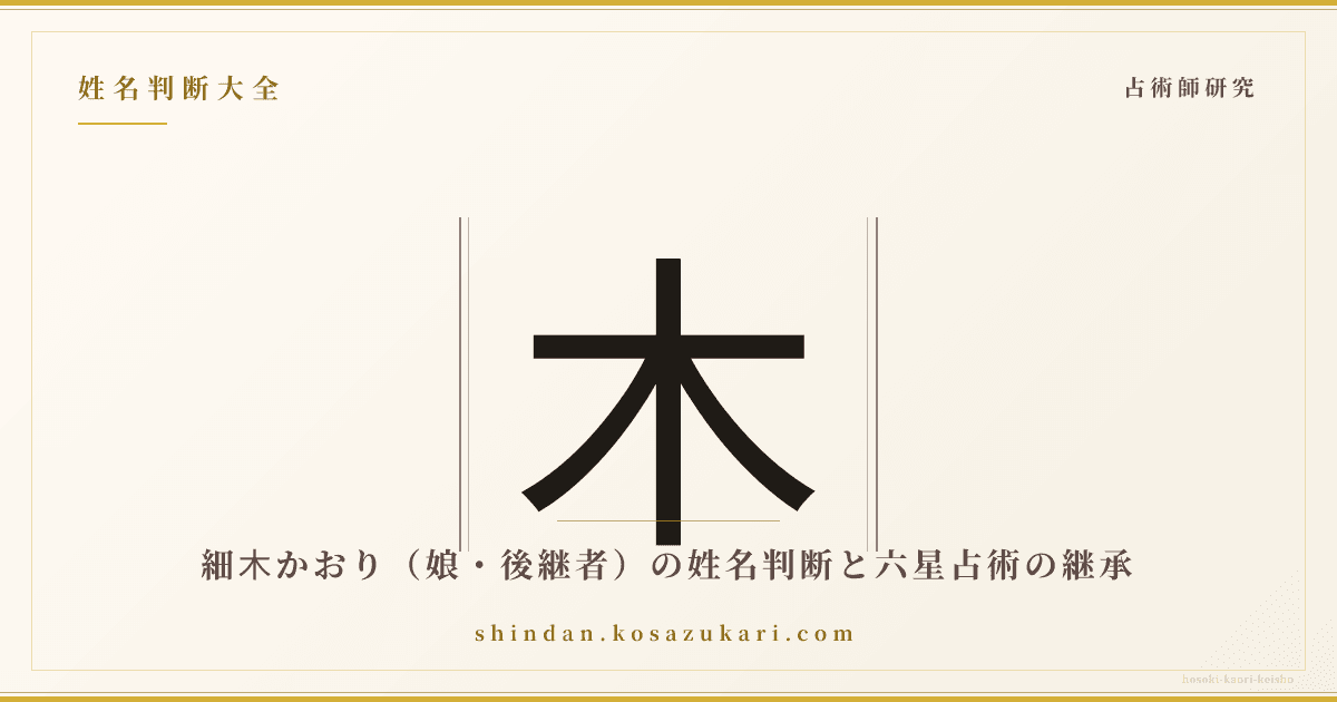 細木かおり(1972-)は、故 細木数子氏(1938-2021)の長女で、母の創始した「六星占術」の正統継承者として現在も活動しています。母娘での占術継承は、戦前の熊崎健翁から現代の五聖閣に至る組織継承とは異なる、家族継承型の占術伝承の現代的事例です。本記事では細木かおりの活動概要、姓名判断「かおり」の字義・画数、母名「数子」との対比、令和の六星占術の現在地までを研究コラムとして整理します。