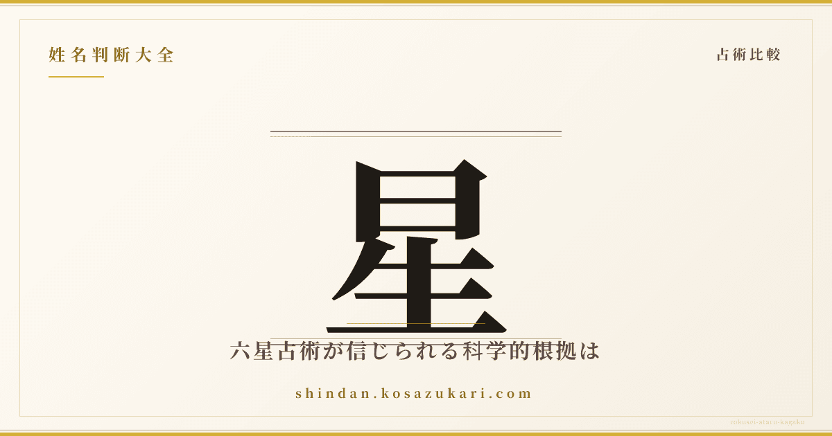 「六星占術は科学的に当たるのか」を決定論的に検証した論文(堀健ほか『社会情報学研究』2003)は、サンプル数1,200名で運命星別の性格傾向を統計検証した結果、ランダム水準と有意差なしを報告しました。同様の検証は西洋占星術でも複数行われ(Carlson 1985, Nature掲載論文など)、ほぼ全て同様の結論です。