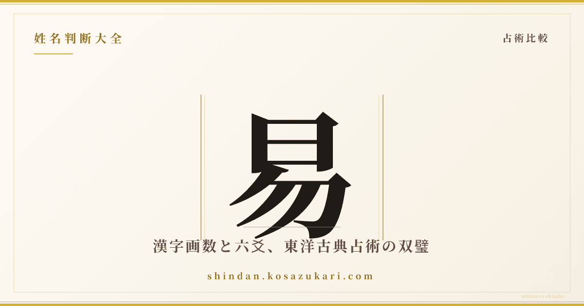 姓名判断は姓名画数による五格分析。両者は計算手続きも入力も全く異なります。易は質問のたびに筮を立てる動的占術、姓名判断は姓名固定で再現可能な静的占術、と性質が対比的です。