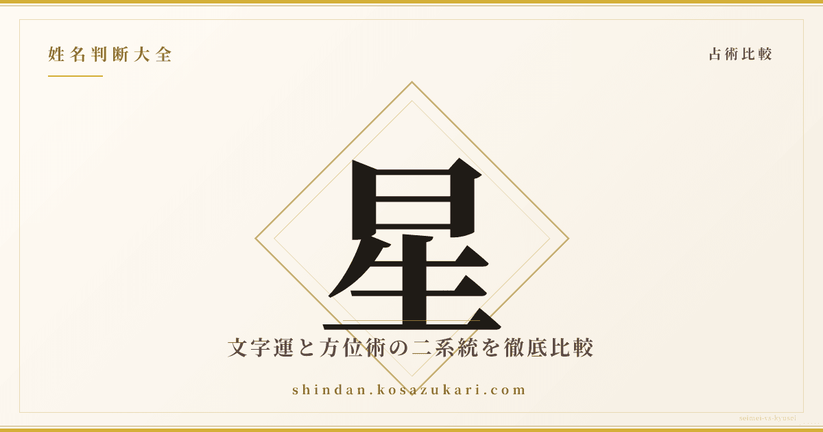 近代日本で同時代に体系化された二大占術が、姓名判断(熊崎健翁・1934)と九星気学(園田真次郎・1924)です。両者とも昭和初期の日本で確立され、現代でも生活占術の二本柱として並び使われています。本記事では、両占術の歴史・計算方法・診断結果の違い、同一人物を両方で占ったときの差、強み弱み、併用法までを比較整理します。