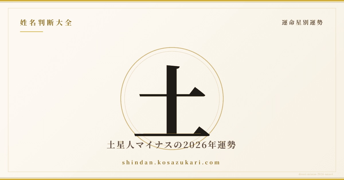 故 細木数子氏(1938-2021)が体系化した六星占術(故 細木数子氏の登録商標)の12タイプのうち、土星人マイナスに該当する人の2026年運勢を年運周期論をもとに整理。仕事・恋愛・健康・金運の四領域を月別に詳細予測し、流派の出典に基づき第三者的にまとめた研究的コラムです。