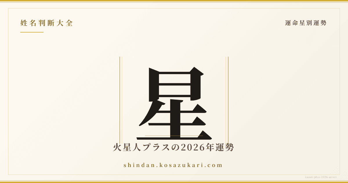 故 細木数子氏(1938-2021)が体系化した六星占術(故 細木数子氏の登録商標)の12タイプのうち、火星人プラスに該当する人の2026年運勢を年運周期論をもとに整理。仕事・恋愛・健康・金運の四領域を月別に詳細予測し、流派の出典に基づき第三者的にまとめた研究的コラムです。