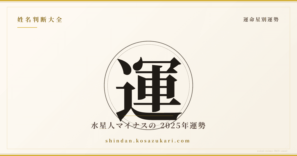 故 細木数子氏(1938-2021)の体系化した「六星占術」(株式会社六星舎の登録商標)を中立的に解説。水星人マイナス(−)の2025年が12周期のどこに位置するか、月別運勢、大殺界中殺界との関係、姓名判断との併用法までを整理した独立メディアの研究記事。